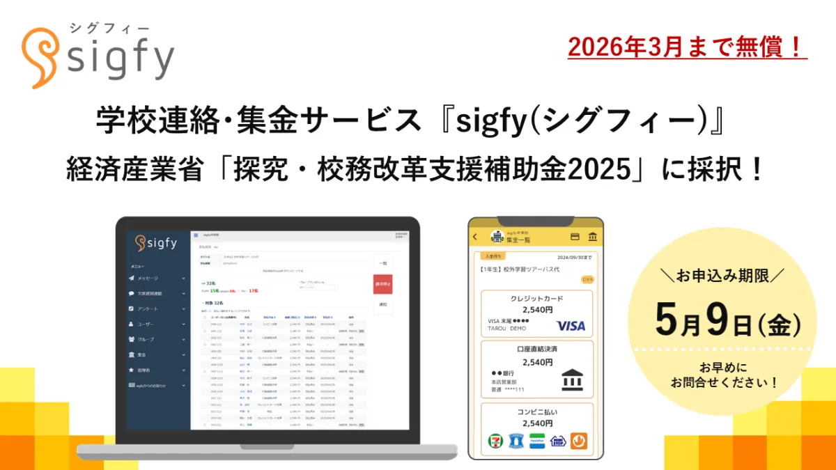 株式会社Fusicが運営する学校連絡・集金サービス『sigfy(シグフィー)』が、経済産業省の「探究・校務改革支援補助金2025」に採択されました。この補助金を活用することで、全国の学校および自治体は2026年3月末まで、このサービスを無償で導入、利用することができます。導入を希望する方は、2025年5月9日までにお申込みを行う必要があります。