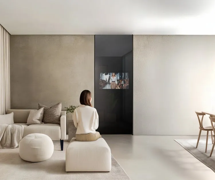 従来の室内ドアは、開閉の際にしか意識されなく、その存在はほとんど無視されることが多いものでした。しかし、MILAOSはその常識を打ち破る製品です。電源をオフにすれば、美しい鏡面仕上げのドアとしてインテリアに調和しますが、電源を入れると映像が映し出される黒いドアに変身します。この機能により、居住空間に新たな価値を与え、生活が豊かになることでしょう。