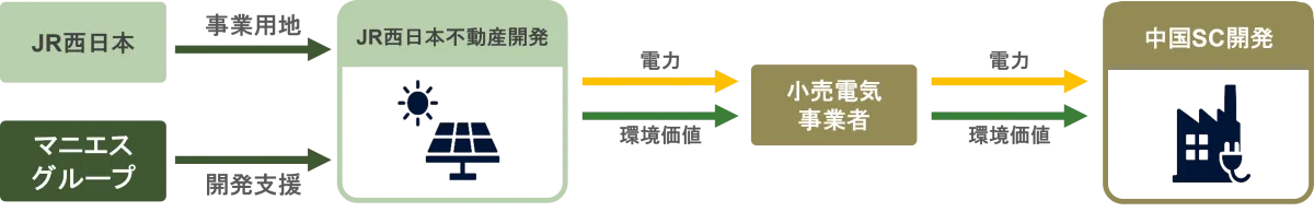 JR西日本グループは、「ゼロカーボン2050」という環境長期目標を掲げ、2050年までにグループ全体のCO2排出量を実質ゼロにすることを目指しています。この目標達成への第一歩となるのが、今回の再生可能エネルギー事業です。JR西日本が所有する遊休地を活用し、自社で太陽光発電所を設けた上で、中国SC開発株式会社が運営する「ミナモア」へと発電されたエネルギーを供給します。