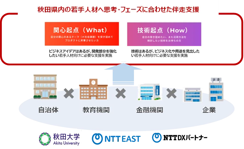 本プログラムは、秋田大学、NTT東日本、NTT DXパートナーが連携して、地域の若手人材養成を目指した取り組みです。経済産業省の後援も受けており、「どんな一歩も、未来への挑戦だ」というテーマのもと、関係機関が協力し合いながら、独自のアイデアや技術を持つ若者の支援に尽力しています。過去の取り組みを参考にしながら、参加者をビジネスアイデアを重視する人と技術を重視する人に分けて、より効果的な育成を進めています。