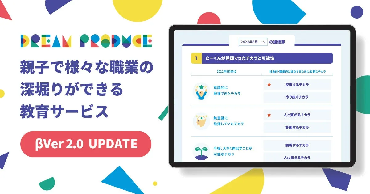 株式会社Dream Produceが提供する、子供たちの未来を応援するWebサービス『Dream Produce』が、バージョン2.0にアップデートされました。最大の特徴は、新たに搭載された「キャリア能力通信簿」機能です。この機能では、子供が日々のサービス利用状況や保護者のアンケート結果を基に、その子の個性や能力を分析。将来の可能性を広げる上で重要な「8つの非認知能力」という観点から、最適な職業を提案します。