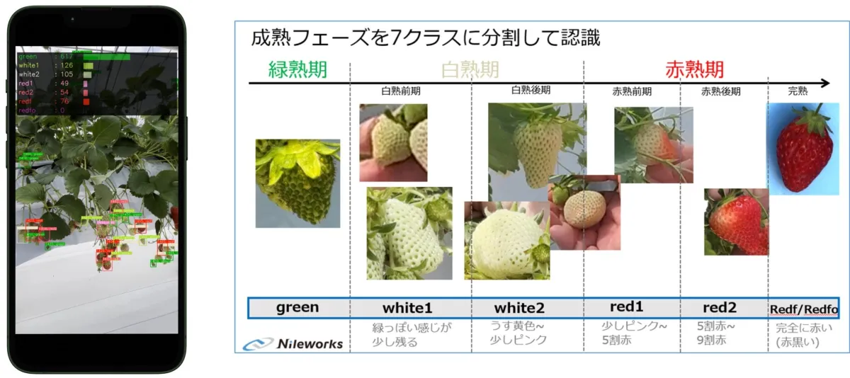 イチゴ栽培は正確な収穫時期と量の予測が求められ、従来は経験や感覚に頼ることが多かった。しかし、そうした方法では時間と労力がかかるため、新たなソリューションが求められていました。そこで登場したのが、ナイルワークスが開発した「イチゴ収量予測ツール」です。このツールを使うことで、スマートフォンで撮影した動画をアップロードするだけで、クラウドでイチゴの熟度判定と生育予測ができるようになります。これにより、従来の方法に比べて、はるかに効率的な栽培管理が可能になります。