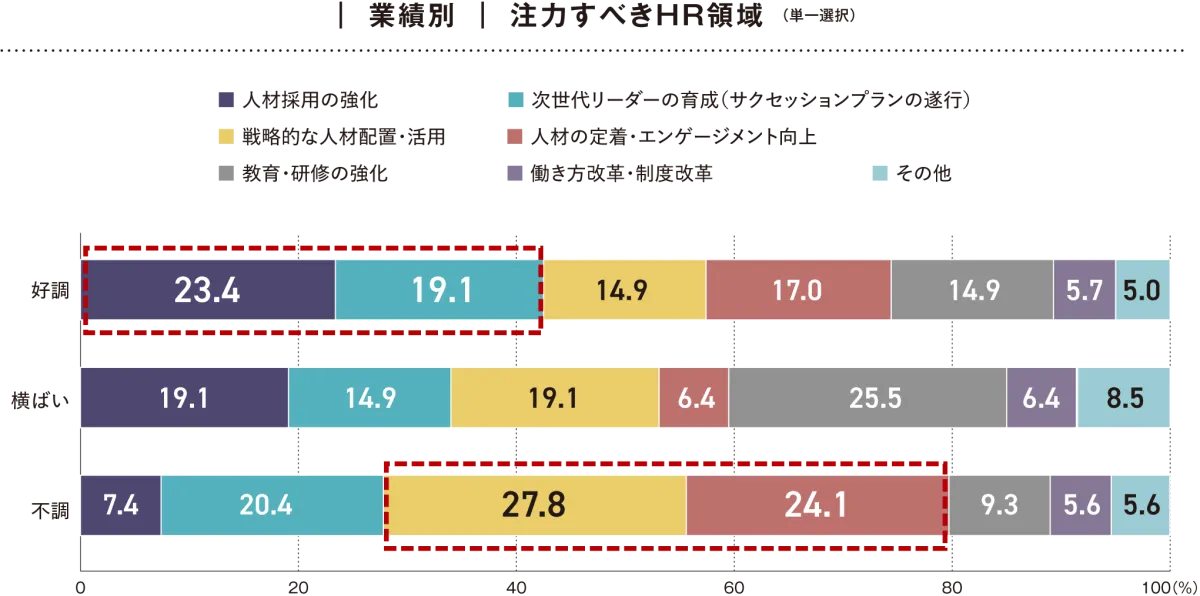 調査の結果、企業の業績状況によって注力すべきHR戦略が異なることが明らかになりました。業績が不調な企業では「戦略的な人材配置・活用」や「人材の定着・エンゲージメント向上」が重要視されている一方、業績が好調な企業では「人材採用の強化」と「次世代リーダーの育成」が求められています。このことから、企業はその成長ステージに応じた人事戦略を考える必要があることが示唆されています。