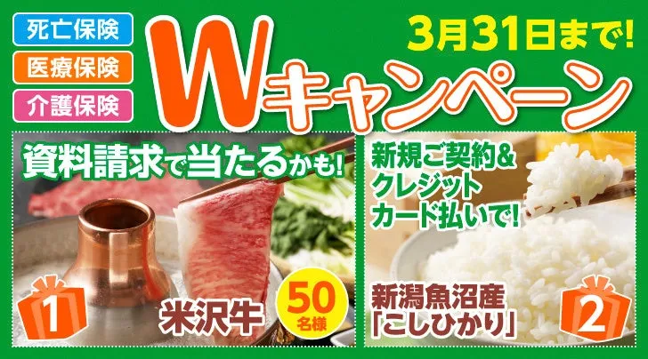 SBIいきいき少額短期保険株式会社が、2025年2月1日から2025年3月31日までの期間中に実施するキャンペーンが注目されています。死亡保険、医療保険、介護保険に関する資料請求をすることで米沢牛が抽選で当たるほか、新規契約時にクレジットカード払いを利用すると、なんと新潟魚沼産こしひかりがもらえるという内容です。