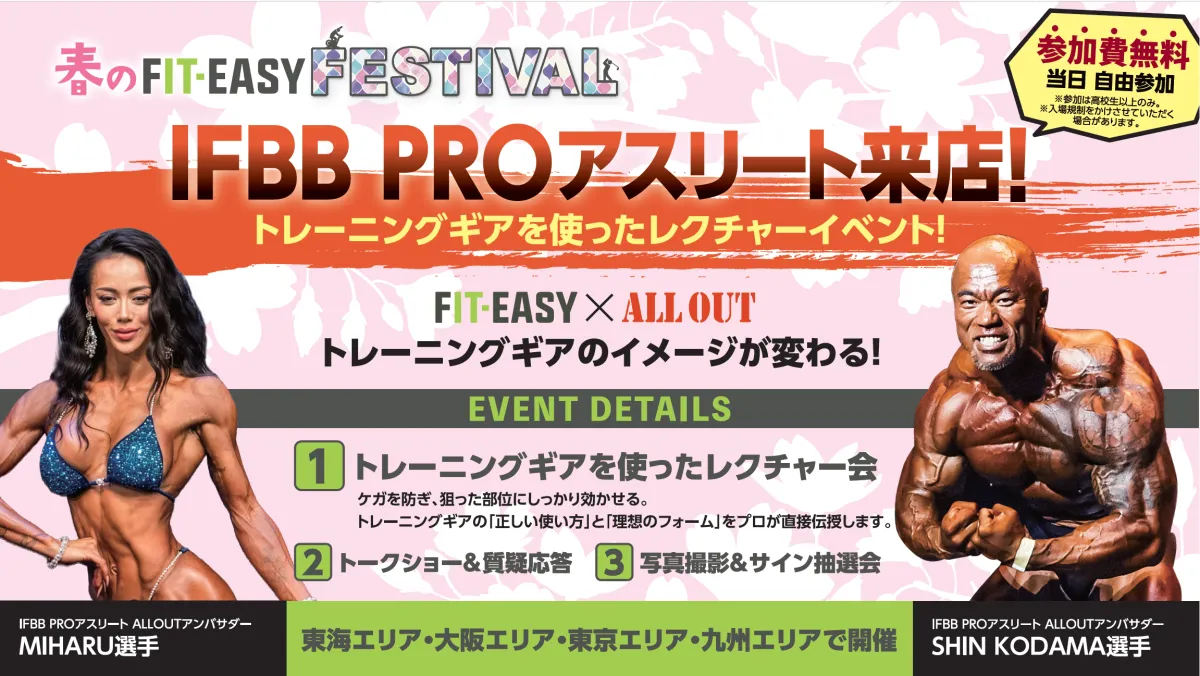 2026年4月から約2か月の間、全国4エリアにて「春のFIT-EASY FESTIVAL」を開催します。フィットイージー株式会社は、アミューズメントフィットネスクラブを運営し、健康的なライフスタイルをサポートすることに力を入れています。今年のイベントでは、世界最高峰のボディビル団体「IFBBプロリーグ」に認定されたアスリートたち、SHIN KODAMA選手とMIHARU選手を迎え、トレーニングクロスの正しい使い方と理想的なフォームについてレクチャーを行います。