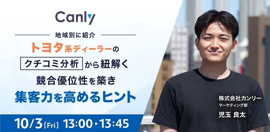 このオンラインセミナー「地域別に紹介・トヨタ系ディーラーのクチコミ分析から紐解く 競合優位性を築き集客力を高めるヒント」では、株式会社カンリーによって提供される内容です。特に、GoogleマップやYahoo!プレイス、Appleマップといった主要なオンラインプラットフォームにおけるクチコミの分析を行います。この分析は業界の最新動向を踏まえたもので、顧客が抱える疑問やニーズに基づき、実践的なアプローチを提案します。