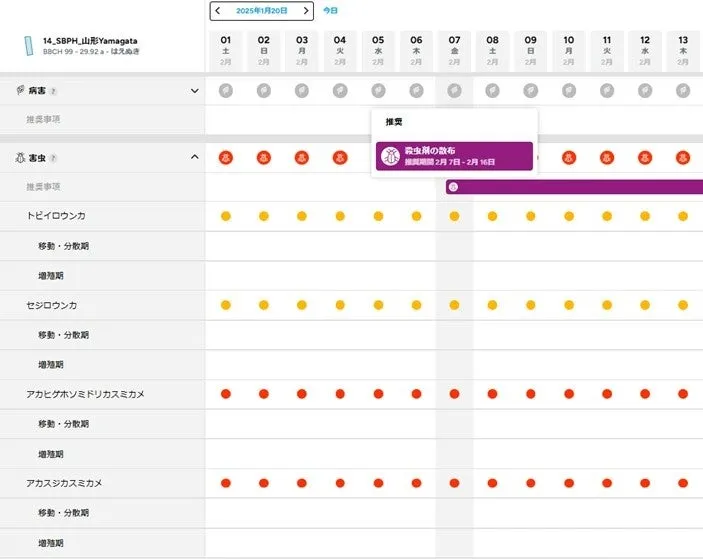 新たに強化された防除タイミングアラート機能では、水稲栽培における病害や害虫を早期に警告することができます。特に重要なのは、水稲に深刻な影響を及ぼす飛来性害虫、たとえばトビイロウンカやセジロウンカ、さらには斑点米カメムシ類です。これらの害虫が発生する適期を通知することにより、坪枯れや不稔米、斑点米のリスクを抑える手助けをします。