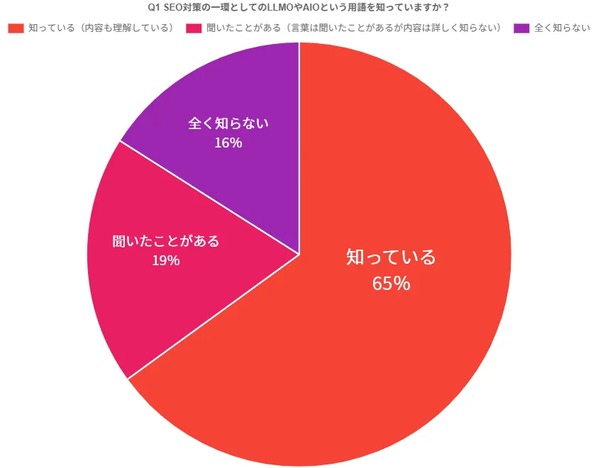 調査の結果、「LLMOやAIOを知っている」と回答した人が全体の65%を占め、次いで「聞いたことがある」が19%、さらに「全く知らない」が16%という結果となりました。このことから、新しい概念に対する関心が高まっていることがうかがえます。しかし、依然として約35%の人々がこれらの用語についての理解が不十分であることも浮き彫りになりました。