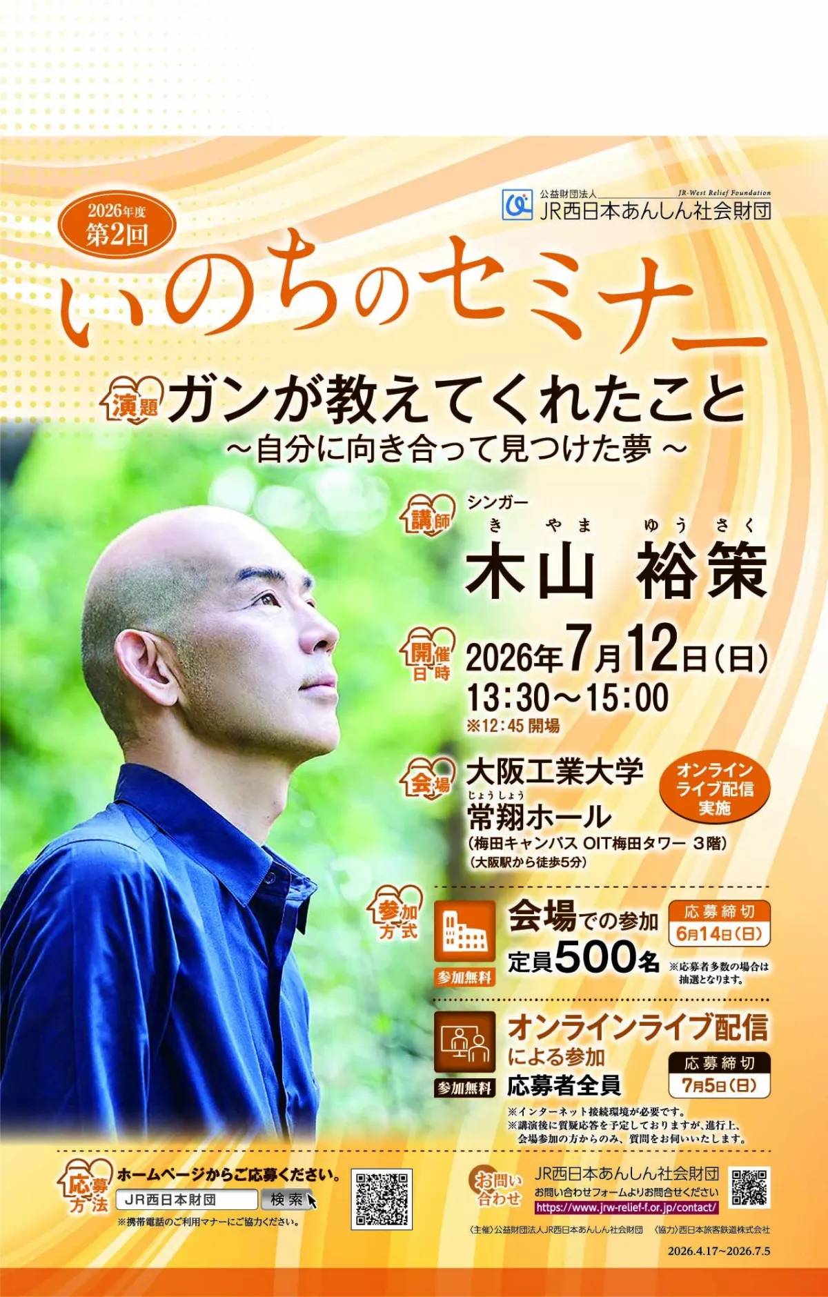 講師には、シンガーであり自身もがんを克服した木山裕策氏をお迎えします。彼はがんとの闘いを通じて得た「生命の大切さ」や、逆境の中で見つけた「希望」のメッセージをお伝えします。木山氏は歌手としてだけでなく、父親や会社員など多面的な人生経験を持つ講師であり、その経験から紡がれた深い言葉は参加者にとって心に響くものとなるでしょう。