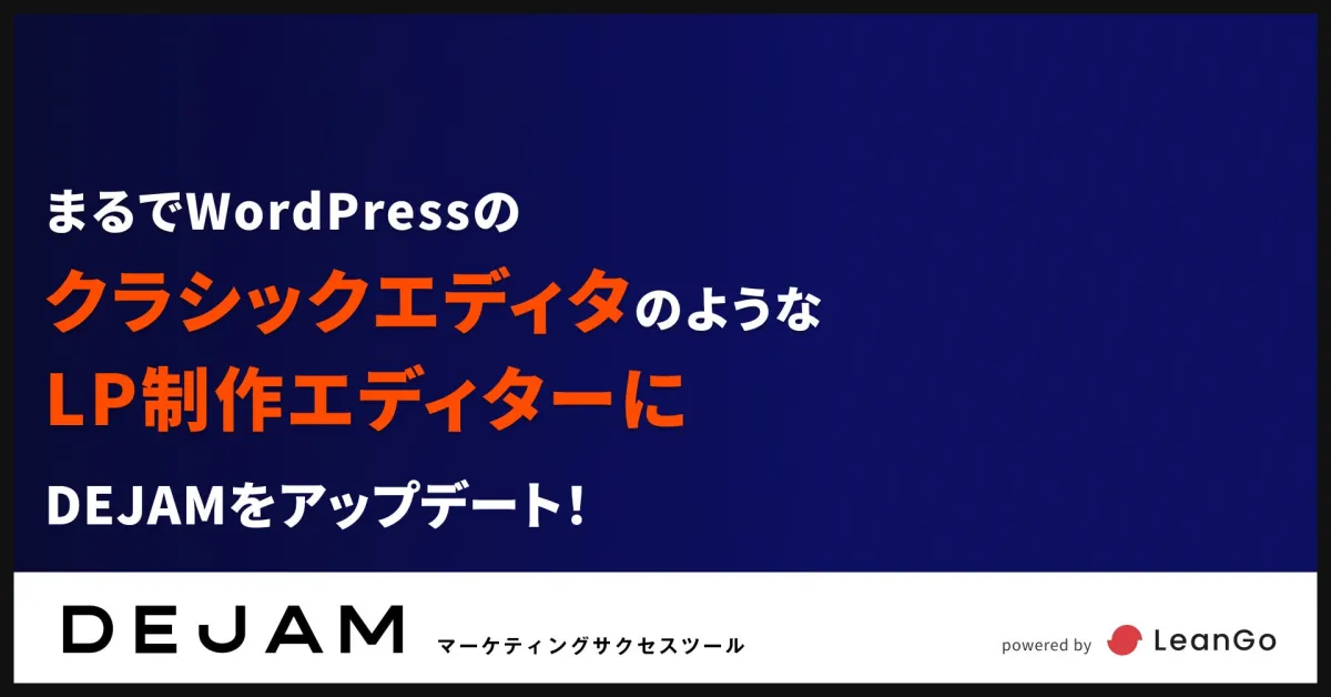 株式会社LeanGoは、自社のマーケティングサクセスツール「DEJAM」のLP制作エディターをリニューアルしました。このアップデートにより、WordPressのクラシックエディタに近い、直感的でシンプルな操作が可能となりました。