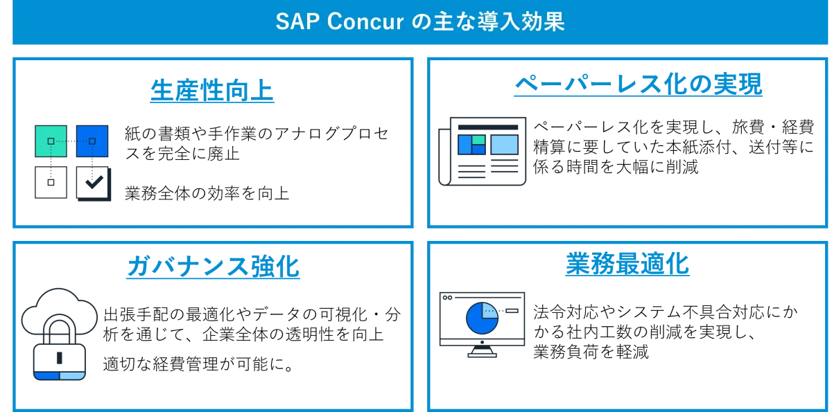 具体的には、出張旅費の管理において、SAP Concurの導入により事前申請の作成や承認プロセスが円滑に進むようになります。また、外部サービスとの連携を通じて、フライトやホテルの予約もスムーズに行うことができ、出張者の負担が軽減されます。