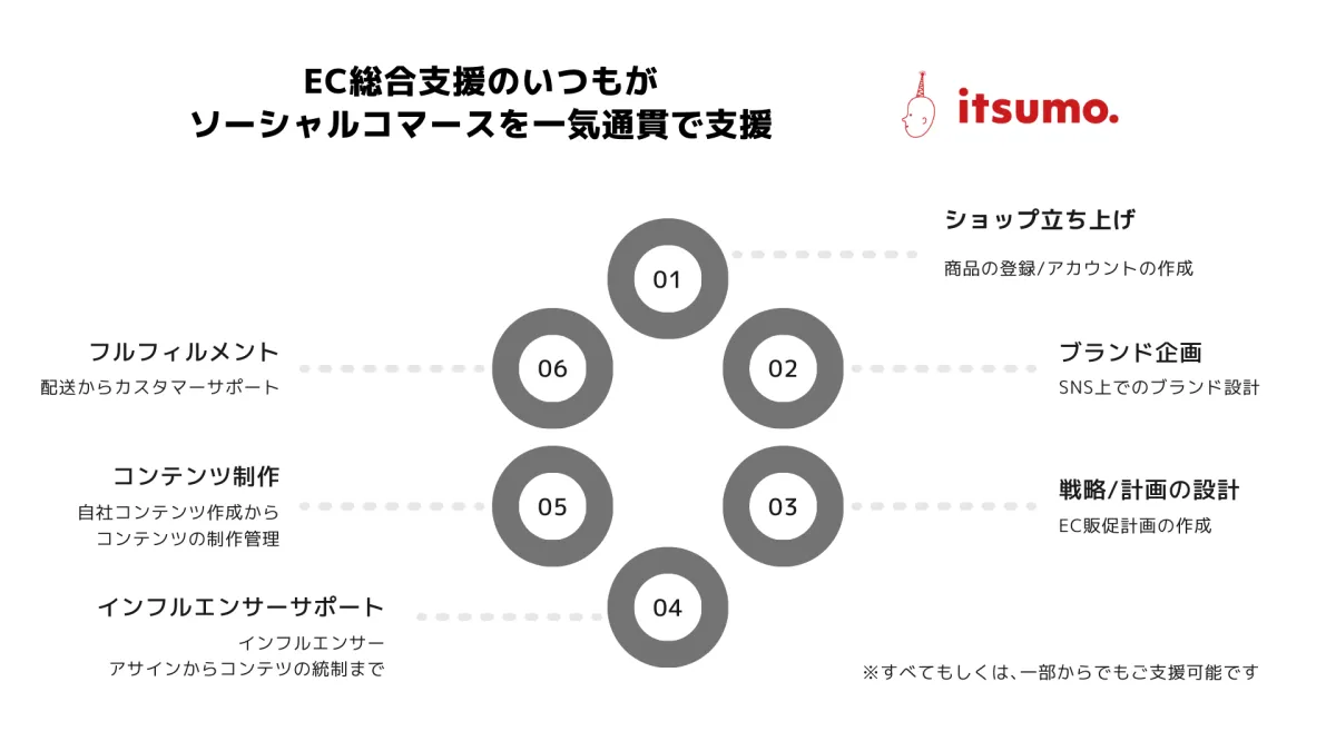 株式会社いつもは「日本の未来をECでつくる」というミッションのもと、EC事業の総合支援を行っています。人とテクノロジーを組み合わせて、法人および消費者向けに新たなビジネスチャンスを創出していくことを目指しています。具体的なプランやサービスの詳細については、公式ウェブサイトをぜひご覧ください。