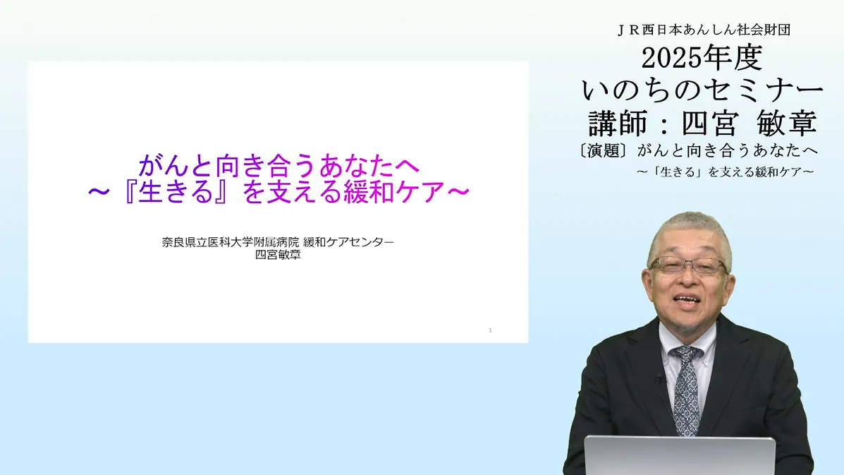 2025年度第3回「いのちのセミナー」が、奈良県立医科大学附属病院の緩和ケアセンター長である四宮敏章氏を講師に迎えて開催されます。このセミナーでは、病気や診断がもたらす心身の影響をどう乗り越え、いかに自分らしく生きることができるのかをテーマに、緩和ケアの重要性についてお話しいただきます。