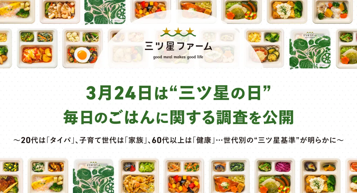2023年3月24日は「三ツ星の日」。この日を記念して、株式会社イングリウッドの運営する冷凍おかず定期便サービス『三ツ星ファーム』が『毎日のごはん』に関する調査を実施しました。この調査によって、世代やライフスタイルが食事に対する意識やこだわりにどのような影響を与えているのかが浮かび上がりました。