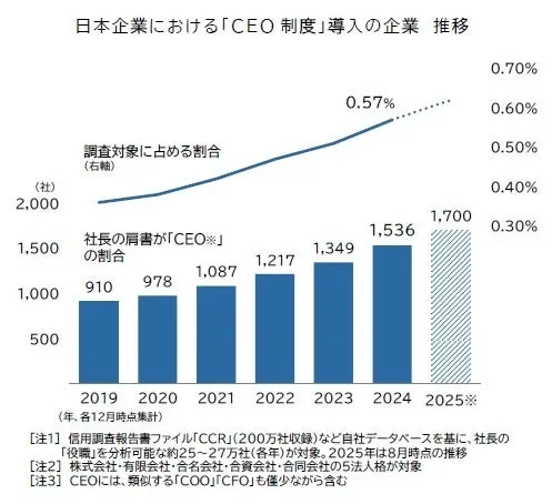 近年、日本企業において「CEO」という肩書きを持つ経営者が急速に増加しています。帝国データバンクの調査によれば、2024年末時点で、経営トップに「CEO」を採用している企業は1536社に達し、前年から13.9%の増加を記録しました。これはコロナ禍前の2019年から1.7倍に増加したことを意味します。特にサービス業、特にIT関連のスタートアップ企業でこの傾向が顕著です。