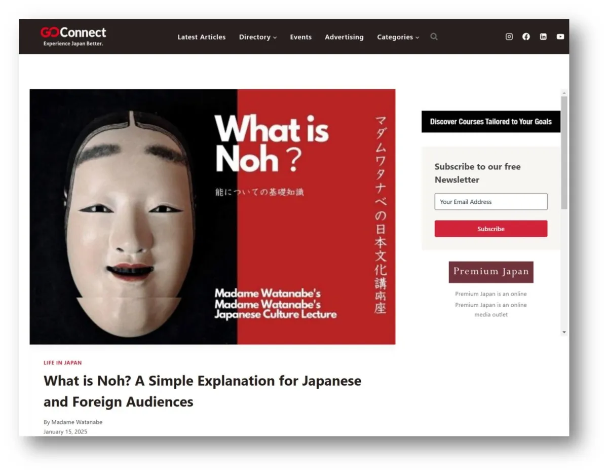 最近、「Premium Japan」は新たなカルチャーコーナー「マダムワタナベの日本文化講座」をスタートしました。この連載では、日本の伝統や文化を外国人にわかりやすく説明し、私たち日本人にとっても新たな発見をもたらす内容が展開されます。第一回のテーマは「能」に焦点を当てたもので、文化の基礎知識を解説。マダムワタナベという謎の日本人女性が、外国人の興味を引くキーワードや、細かな文化について解説を行っていきます。