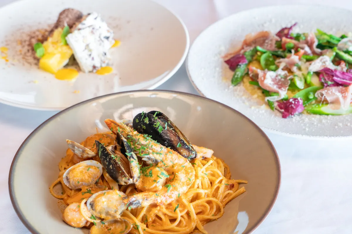 トマトクリームと卵黄のペスカトーラです。新鮮な魚介類が贅沢に使用され、濃厚なトマトクリームソースと絡むことで絶妙なハーモニーが生まれます。さらに、卵黄が料理に深みを加え、からすみと桜海老がその風味を引き立てる特別な一品です。