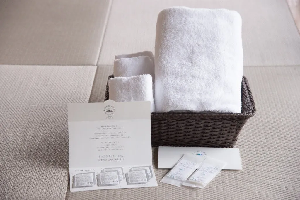 かみくらでは、滞在中に使用するスキンケア用品やタオルなどのアメニティにこだわりがあります。肌に直接触れるものだからこそ、天然由来の成分のみを選び、石油系成分や防腐剤、シリコン、合成香料を一切使用しない製品を取り揃えています。これにより、心地よい使用感とともに、環境にも優しい選択を実現しています。