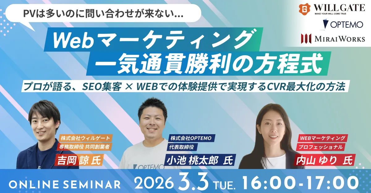 2026年3月3日、株式会社みらいワークスは、株式会社ウィルゲートと株式会社OPTEMOと共催でオンラインセミナーを開催します。このセミナーでは、Webマーケティングの最新手法について、特にSEO集客と商談化に焦点を当て、経営層やマーケティング部門の方々に向けた内容となっています。