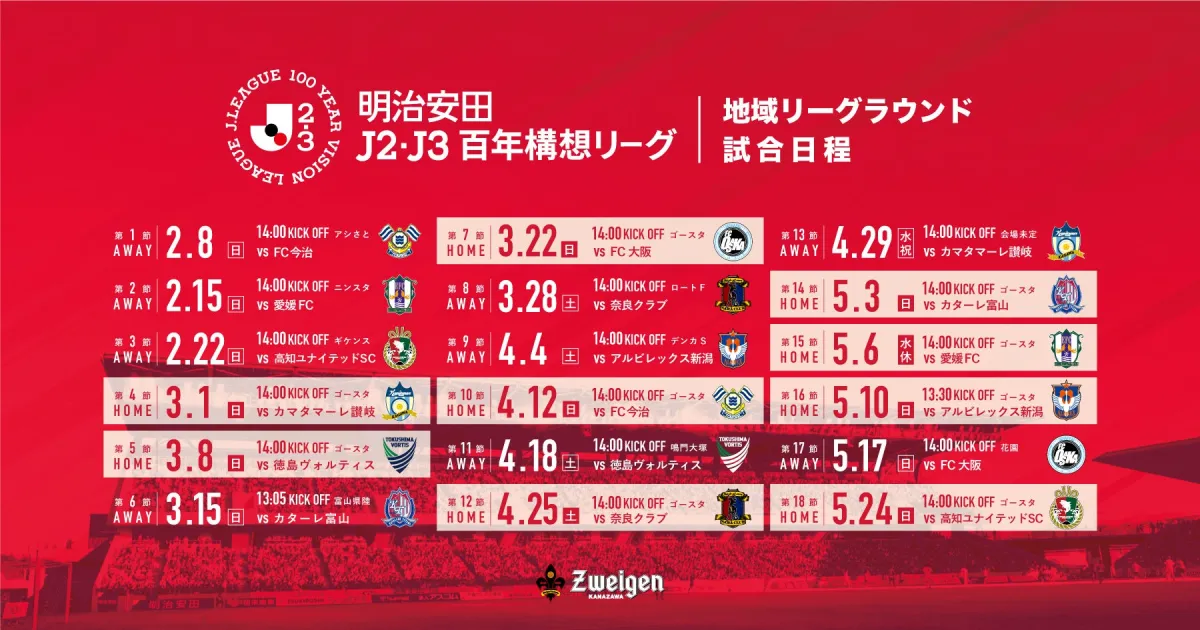 今回は、試合日程にも変更があり、第14節および第18節が決定しました。またプレーオフラウンドの1回戦は、5月31日(日)14:00に金沢ゴーゴーカレースタジアムで開催されます。この変更点により、特にファンの皆様にとっては重要な情報となります。