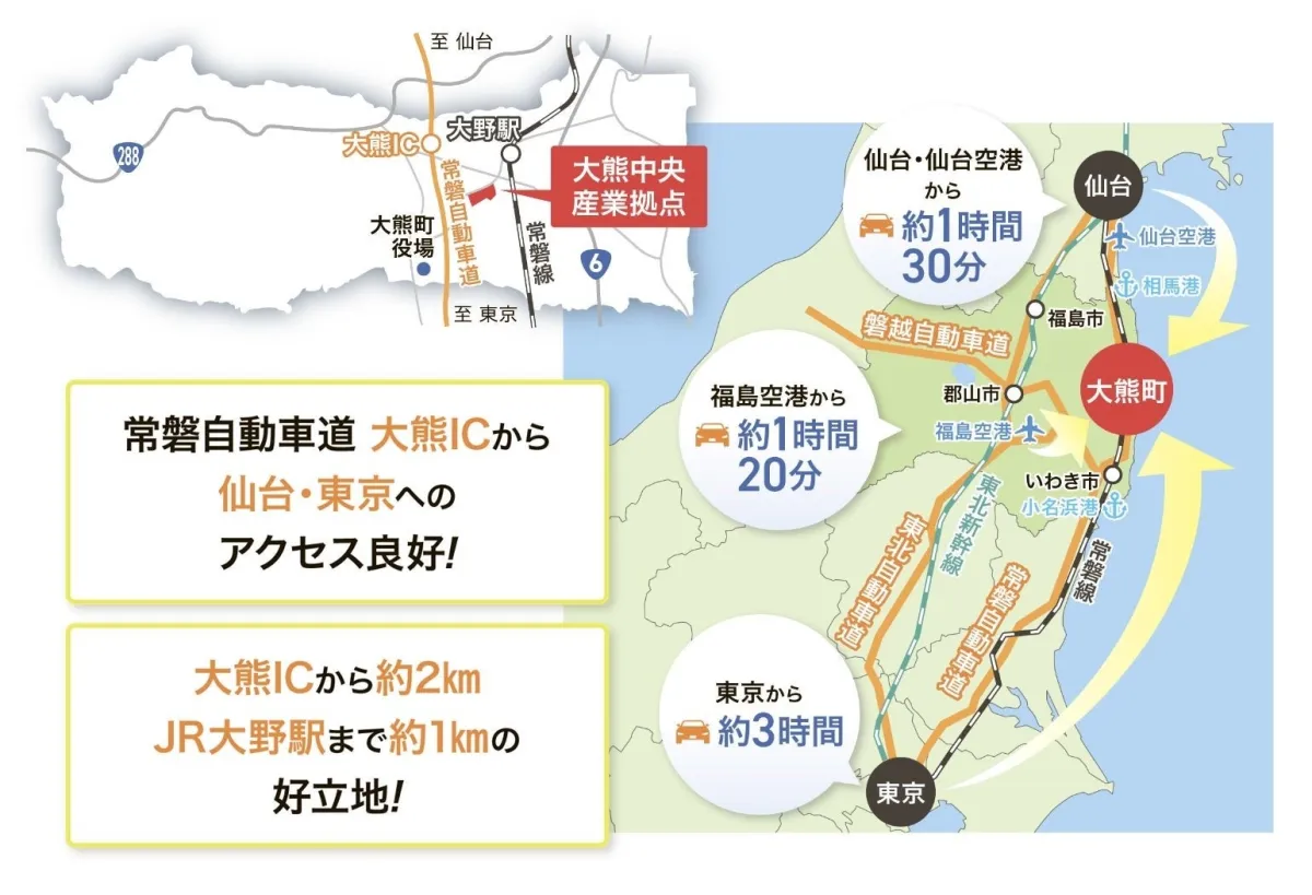 大熊町は福島県の太平洋沿岸に位置しており、交通の便も非常に良いです。仙台市まで車で約1時間30分、東京までは車で約3時間という距離にあり、常磐自動車道の大熊ICや福島空港、仙台空港へのアクセスも充実しています。この立地の良さは、企業のスムーズな運営の大きな要素となっています。