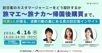2026年4月16日(木)に、株式会社Onwordsを中心に、WAmazing株式会社、株式会社MATCHA、アジアンブリッジ株式会社の代表らが集結し、訪日インバウンドマーケティングに特化したウェビナーをオンラインで開催します。タイトルは「訪日客のカスタマージャーニーをどう設計するか」。参加は無料で、事前登録が必要です。