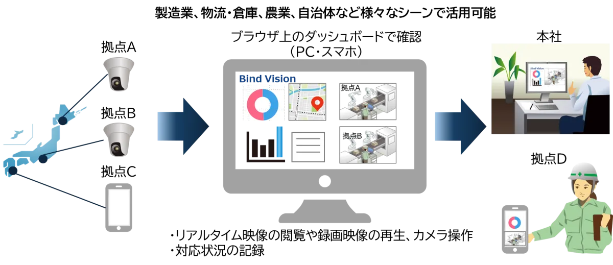 「Bind Vision」は防災や特定用途に留まらず、製造業や倉庫業、農業において現場の情報基盤として機能することを目指しています。従来バラバラに管理されがちだった映像データと判断をひとまとめにすることで、業務負担の軽減、迅速な対応、そして改善につなげる支援が期待されています。