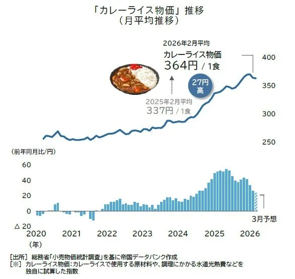 2026年3月に関しては、原油価格の急騰が今後のカレーライス物価に与える影響についても注視が必要です。東京都区部の物価動向を基にした予測では、363円台での推移が見込まれるこの月のカレーライス物価も、イラン情勢の悪化などによる原油価格の変動により、再び上昇する可能性があります。特に、食材の価格高騰に伴って、物価が引き続き高止まりするリスクが存在しています。