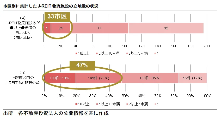 日本の不動産投資信託(J-REIT)は、広範囲にわたって物流施設を保有していますが、その分布は特定の地域に集中しています。なんと、196の市区の中で、全体の約47%が33の市区に固まり、この現象は地域ごとの個性を際立たせています。このことは、物流施設の投資や開発において、地域ごとのエンドテナントの需要を分析することが重要であることを示唆しています。