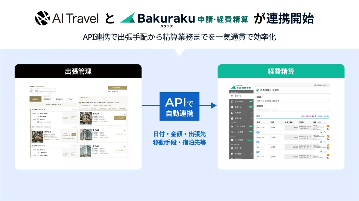 出張者は「バクラク」を利用して精算を行う際、AI Travelで手配した情報がAPI連携によりワンタッチで明細に自動入力されます。これにより、入力ミスが減り、申請内容の確認の手間も大幅に軽減されることで、スムーズな業務運営が期待されます。今後も両社は連携を強化し、さらに効率的な出張精算業務を実現すべく取り組みを進めていくとのことです。