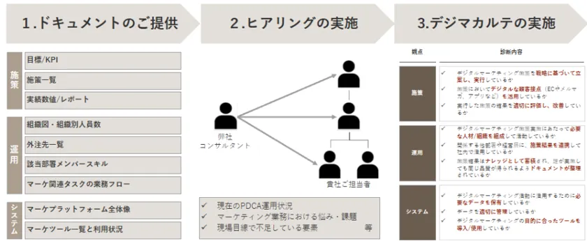 これら3つの観点から企業のデジタルマーケティングの状態を診断し、整理された課題をもとに効果的なステップを提案するのが「デジマカルテ」の特徴です。