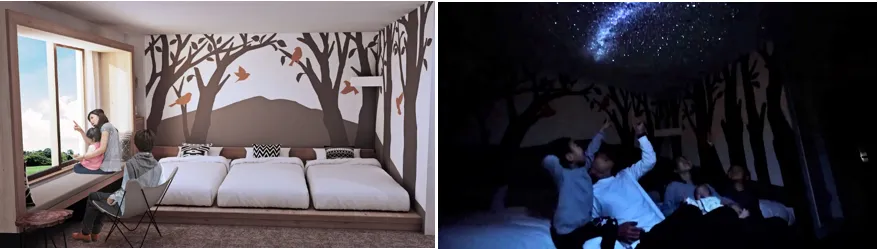夜になると、天井には満点の星空が投影され、まるで自然のプラネタリウムの中にいるかのような幻想的な空間が演出されます。一日中大自然に囲まれた贅沢な時間を過ごした後、星空の下で眠りにつくことができるのは、このネイチャールームだけの特別な体験です。