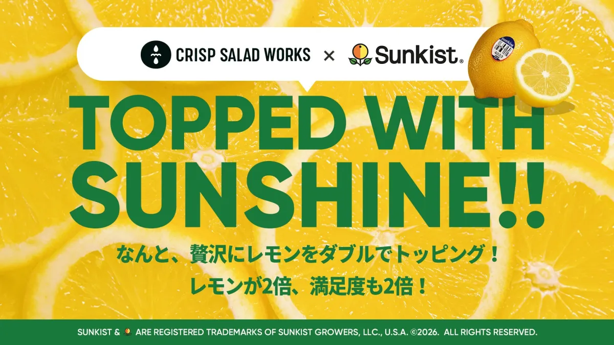 サンキストレモンは、カリフォルニア産の高品質なレモン。太陽の恵みをたっぷりと受けたこのレモンが加わることで、サラダに爽やかな酸味と食感を与え、初夏にぴったりのメニューに仕上がりました。これまで「レモンスクイーズ」として親しまれてきた方法から一歩進んだ新感覚のサラダが楽しめます。販売は、2026年5月6日(水)から6月2日(火)までの期間限定。クリスプサラダワークスの全店舗で購入可能です。