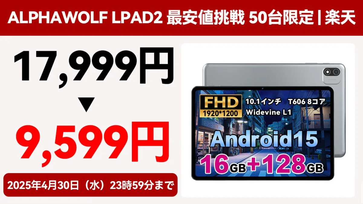 Alphawolfが提供する新型タブレット、「Lpad2」の特別セールが実施中です。通常価格17,999円のところ、なんと9,599円で提供されるこのキャンペーンは、4月25日(金)から4月30日(水)までの期間限定で、数量は50台のみとなっています。