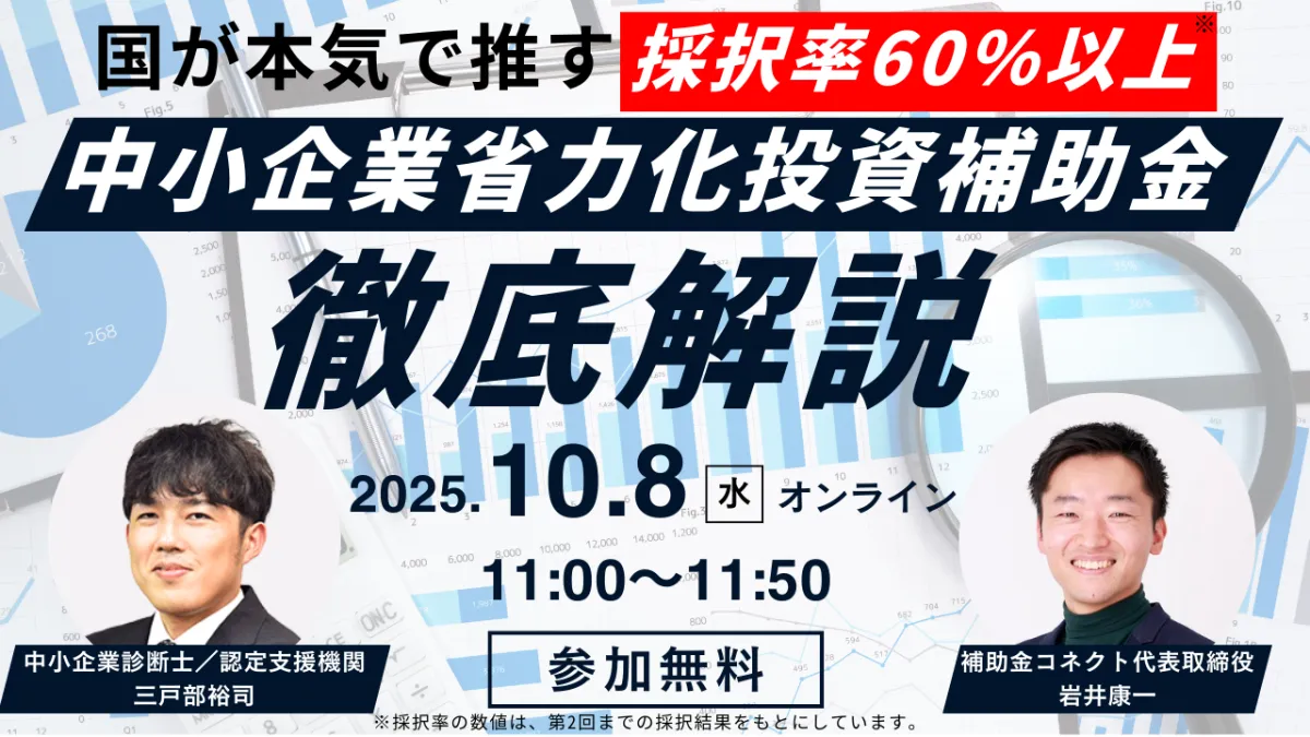 補助金コネクト株式会社は、2025年10月8日(水)にオンラインで無料のセミナーを開催します。このセミナーでは、省力化投資補助金の概要や採択率、実際の申請事例を詳しく解説します。高採択率を誇るこの補助金の特性やそれを活かすための戦略を学ぶ絶好の機会となります。