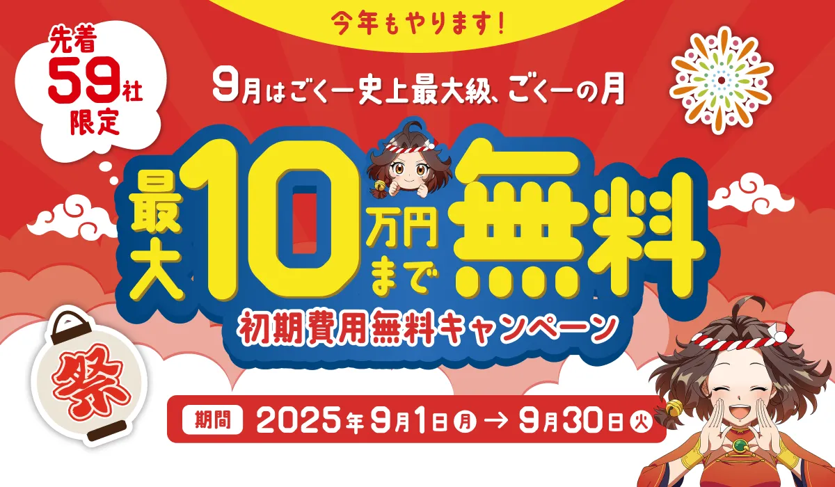 「ごくーの月キャンペーン」は、2025年9月1日から2025年9月30日までの期間で開催されており、先着59社までの申し込みを受け付けています。この独自の特典として、新規ユーザーは初期費用最大10万円を無料で受けられるほか、すでに利用中のユーザーはオプションの追加やプラン変更でも同様の特典を使用できます。