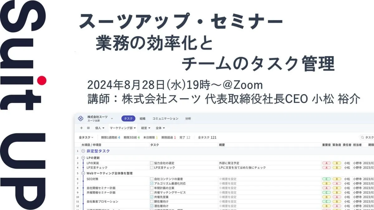株式会社スーツは、2024年8月28日(水)19時から、業務の効率化とチームのタスク管理をテーマとした無料セミナーを開催します。このセミナーは、当社の代表である小松裕介が講師を務め、効果的なタスク管理方法を参加者に伝授します。
