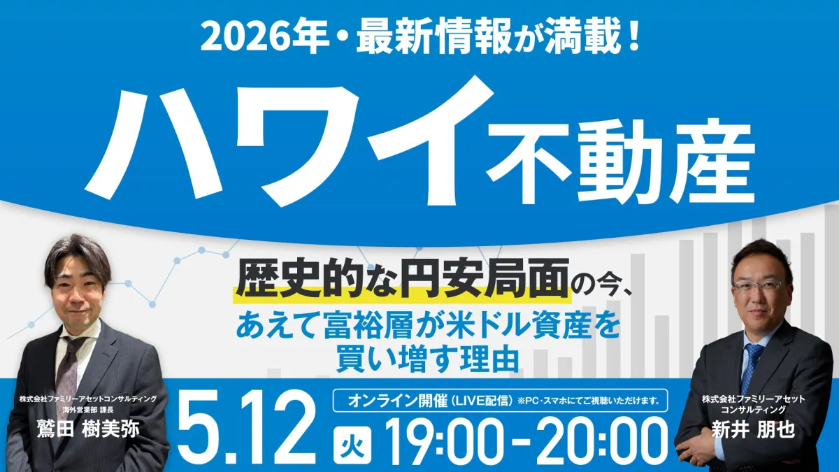 円安局面の影響を受け、資産の多様化がますます重要になっています。特に、米ドル建ての実物資産であるハワイ不動産は、多くの投資家が注目しています。そんな中、株式会社幻冬舎ゴールドオンラインが2026年5月12日(火)にオンラインで開催する「ハワイ不動産に関する無料ウェビナー」は、資産防衛や不動産投資に関心がある方にとって、見逃せないイベントです。