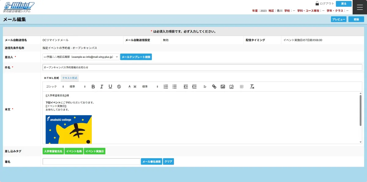 - - オープンキャンパス参加率の最大化:参加申し込みのタイミングでメールを送信し、高校生の不安を解消し、来校を促進します。