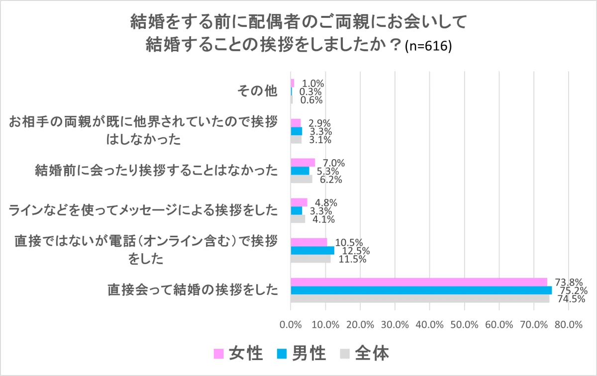 調査結果によると、74.5%の既婚男女が結婚前に相手の両親に「直接会って結婚の挨拶」を行ったと答えています。この割合は非常に高く、他の形式(電話やオンラインなど)を含めると86.0%にものぼります。これによって、大半のカップルが、結婚という重要なイベントに対し、両親への挨拶を重視していることがわかります。