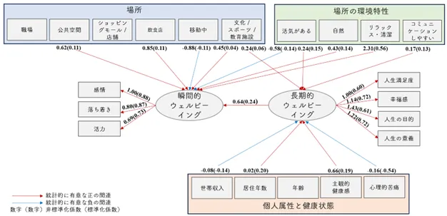 2022年4月から5月にかけて、柏の葉エリアに住む273名の成人を対象に、調査を実施しました。参加者は日常の経験を記録するスマートフォンアプリを使用し、場所の快適さや不快さ、その時の気持ちに関する900件以上のデータが収集されました。この結果、公共空間や飲食店、文化・スポーツ・教育施設といった環境が、ウェルビーイングに、瞬間的にも長期的にも有意な影響を与えることが示されました。