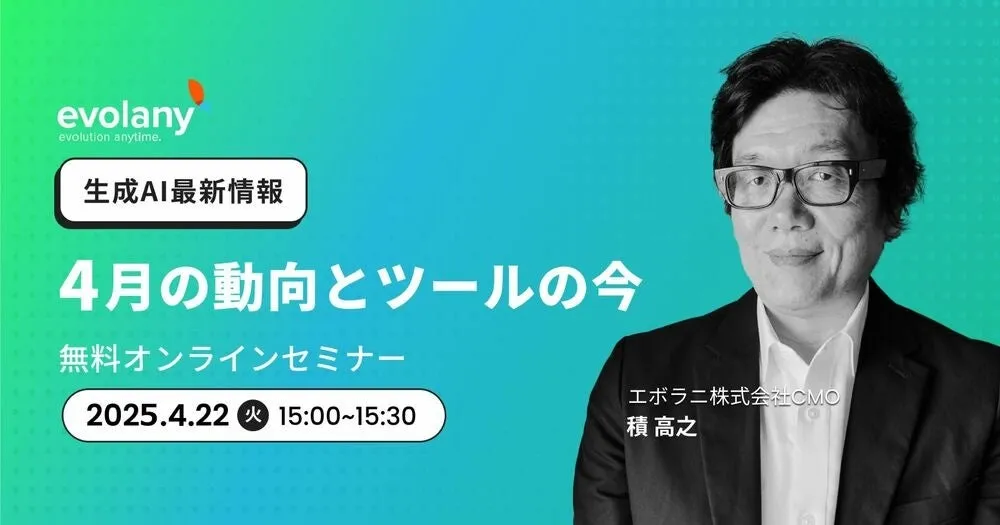 2025年4月22日、エボラニ株式会社が主催する無料オンラインセミナーが開催されます。この30分間のセミナーでは、生成AIの最新トレンドやビジネスでの活用方法について、専門の講師が詳しく解説します。