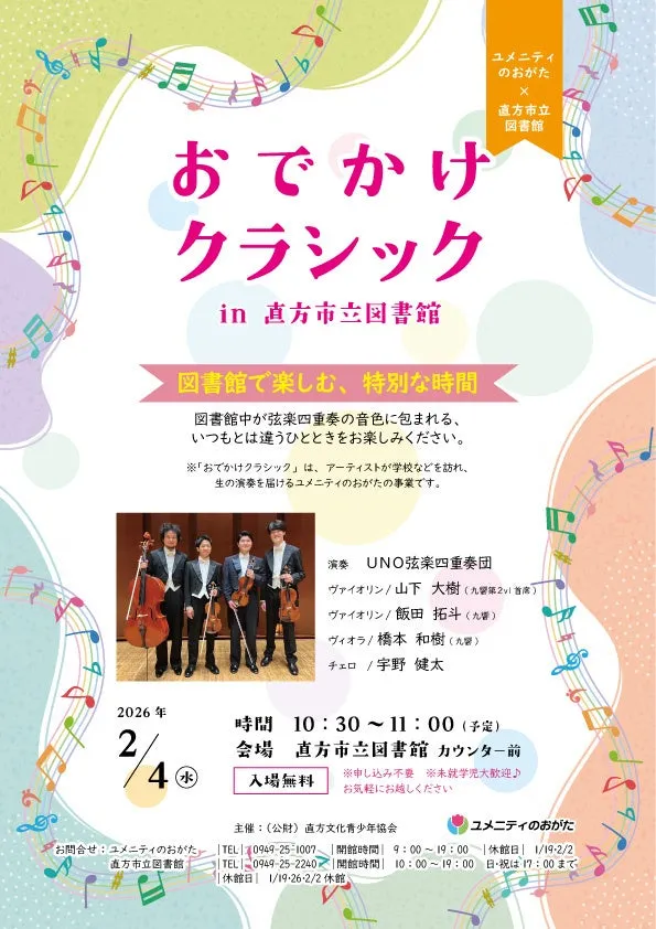 イベント名は「おでかけクラシック in 直方市立図書館」。開催日時は2024年2月4日(水)10:30から11:00まで。場所は直方市立図書館のカウンター前です。入場は無料で、事前の申し込みも不要ですので、気軽にお立ち寄りいただけます。