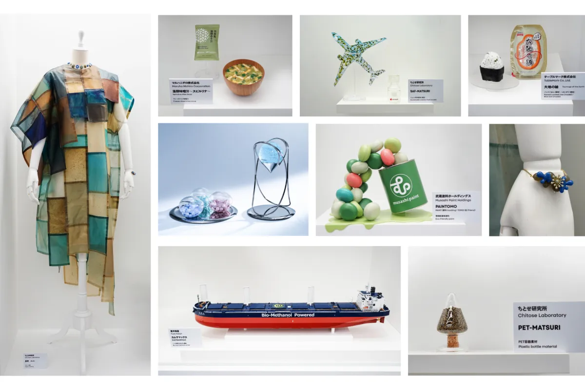 また、展示品には藻類から得られる持続可能な航空燃料「SAF-MATSURI」もあります。これは、藻類由来の油を使用した実用的な燃料として、未来の空の移動方法を変革する可能性を秘めています。さらに、世界初の100%バイオPET樹脂「PET-MATSURI」も視覚化されており、これは従来の化石資源に頼らない新たな素材です。