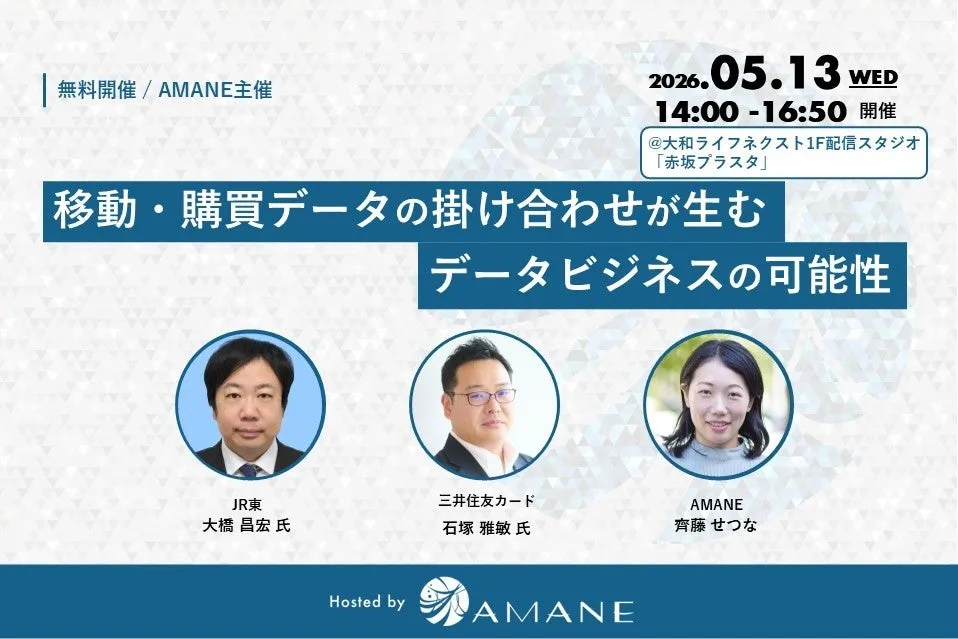 2026年5月13日、東京都赤坂にて「移動・購買データの掛け合わせが生むデータビジネスの可能性」というテーマのセミナーが開催される。このイベントでは、東日本旅客鉄道株式会社(JR東)及び三井住友カード株式会社、そして株式会社AMANEの専門家が登壇し、移動データと購買データの相互作用が生む新たなビジネスチャンスについて議論を展開する予定だ。
