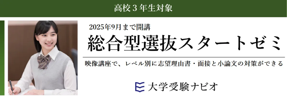 大学受験ナビオが展開する「総合型選抜スタートゼミ」は、2025年9月まで高校3年生を対象に開講されています。この課題は、近年増加している総合型選抜入試に特化したカリキュラムで、受験生が必要とするスキルを体系的に学べるのが特徴です。
