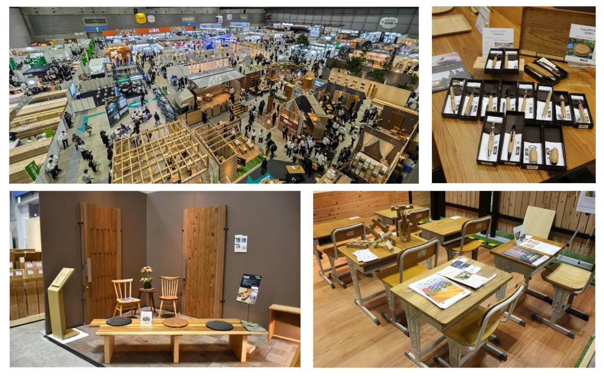 今回の博覧会では、ナイス株式会社が開発したオリジナル素材「Gywood®」が特に注目されました。この素材はスギの大径材を活用し、圧密処理されたもので、住宅や非住宅、さらには非建築分野において多様な使い方が提案されています。展示では、家具から建具、住宅設備機器まで、さまざまなアイテムが並び、訪問者は実際の使用シーンを想像しながら見学していました。また、オフィス用テーブルや学校机、さらには木製の筆記具なども展示され、木質化の幅広い可能性が感じられました。