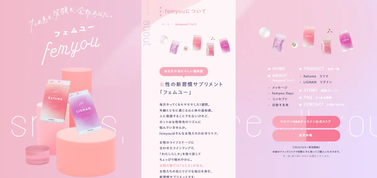 『femyou(フェムユー)』のことをもっと知りたい方には、専用のブランドサイトが用意されています。このサイトでは、商品の詳細情報や、ブランドの理念、女性特有の健康に関連した新習慣などが紹介されています。また、背景のグラデーションが変化するデザインは、女性の感情や体のリズムを表現しており、親しみやすさを感じさせる作りになっています。