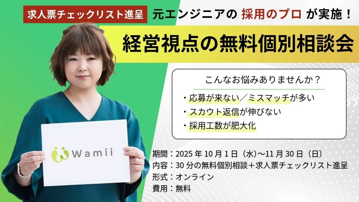 ワミィ株式会社は、2025年10月1日(水)から11月30日(日)まで、元エンジニアとしての視点を持つ採用コンサルタントによる無料個別相談会を開催します。この機会に、貴社の採用活動を見直し、効率化するためのヒントを得てみませんか。