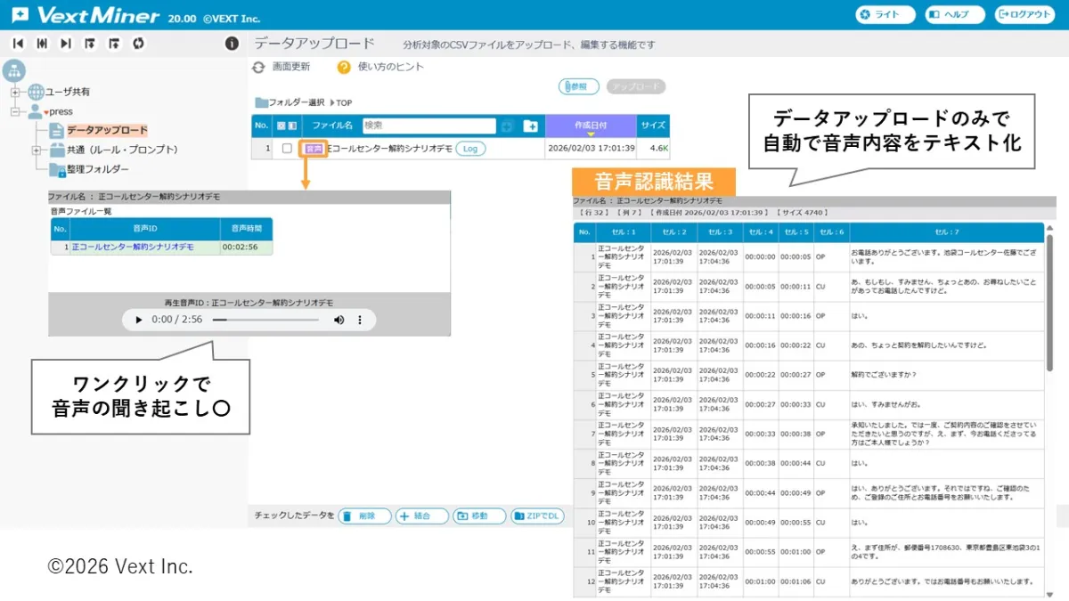 特に興味深いのは、ZIPファイルを利用した複数の音声の一括アップロードに対応している点です。これにより、大量の通話データを効率的にテキストへと変換することができます。音声データがVextMiner上で再生可能であるため、通話の聞き起こしや音声認識結果の確認も簡単です。